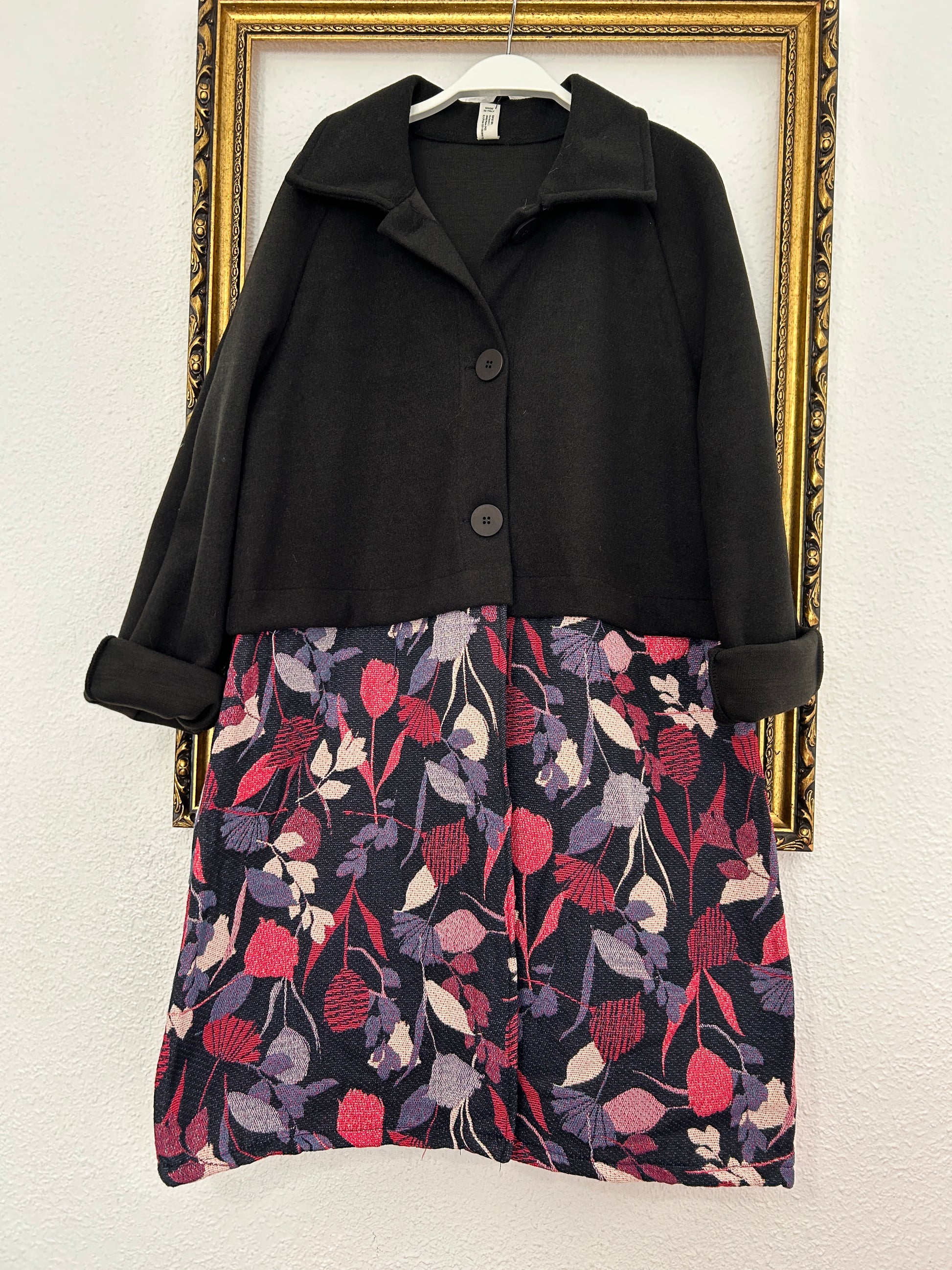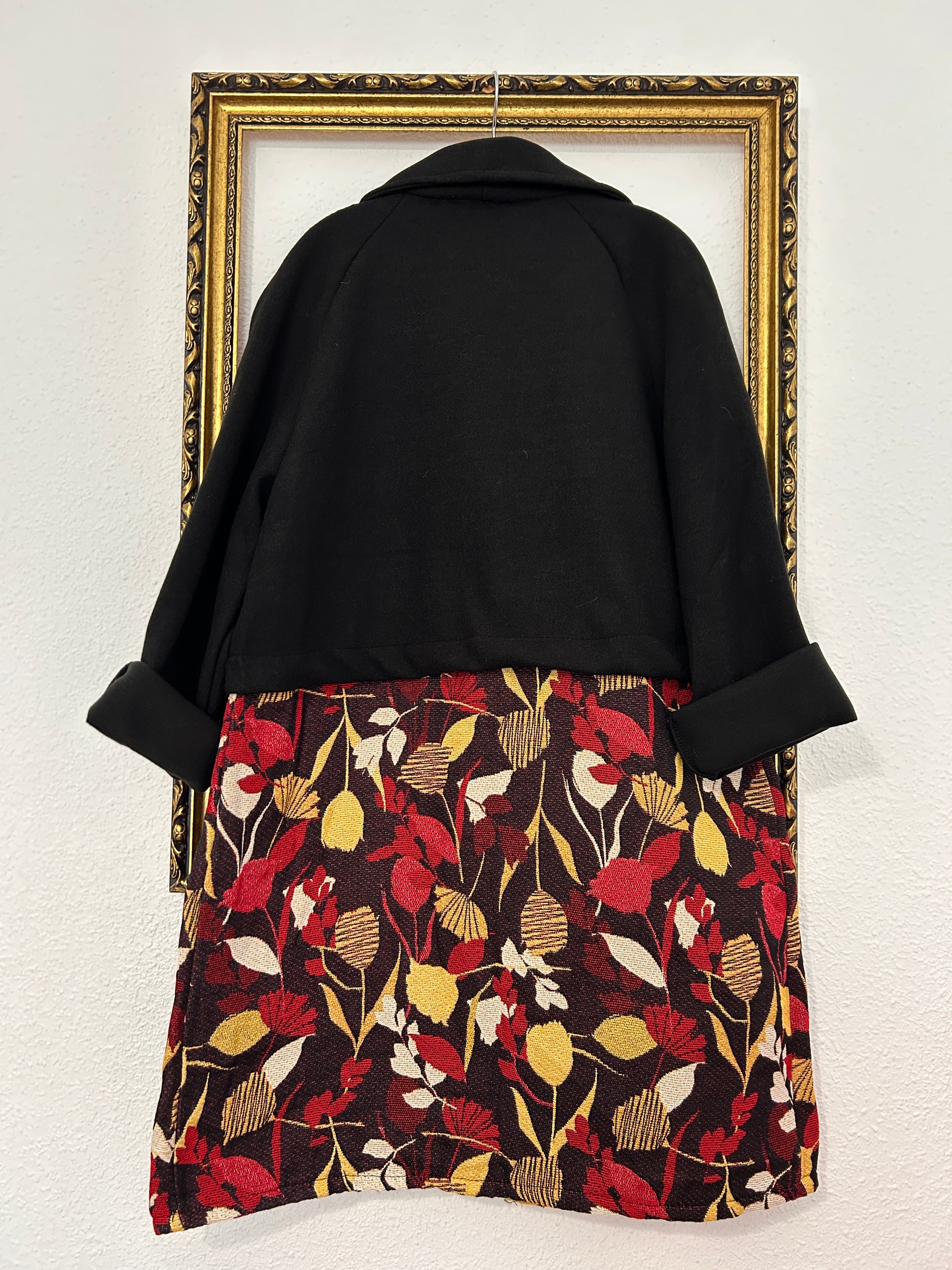 Precioso abrigo realizado en una combinación de paño y tela de tapicería con estampado floral. Es talla única de corte recto y sus medidas 110 sisa total, y largo 93. Disponible en dos tonos