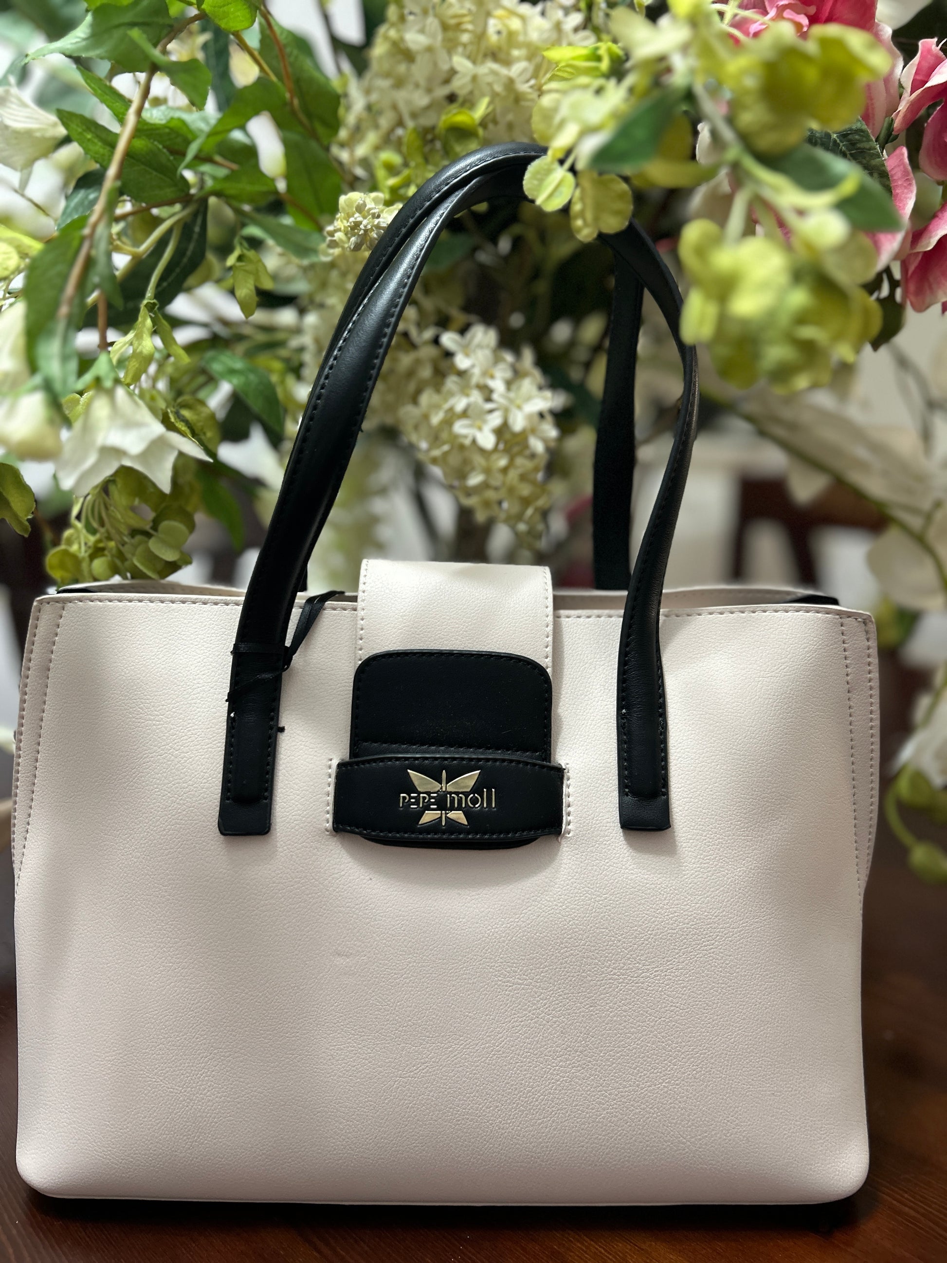 Bolso de hombro, con posibilidad de bandolera, material sintetico, combinado en rosa y negro.