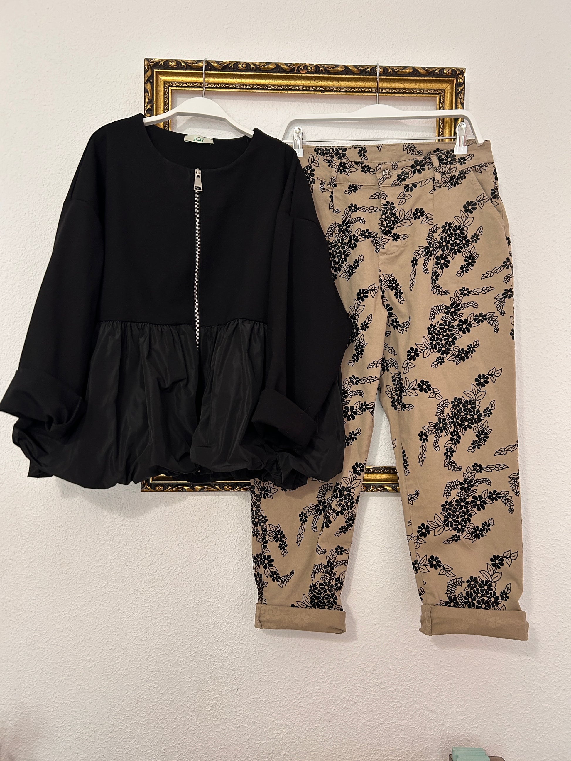 Preciosa chaqueta con cremallera central, la parte de arriba es en algodón y elastán, y la parte de abajo en tafetán y abullonada. Súper favorecedora, es talla única y sirve desde una 42 hasta una 46.