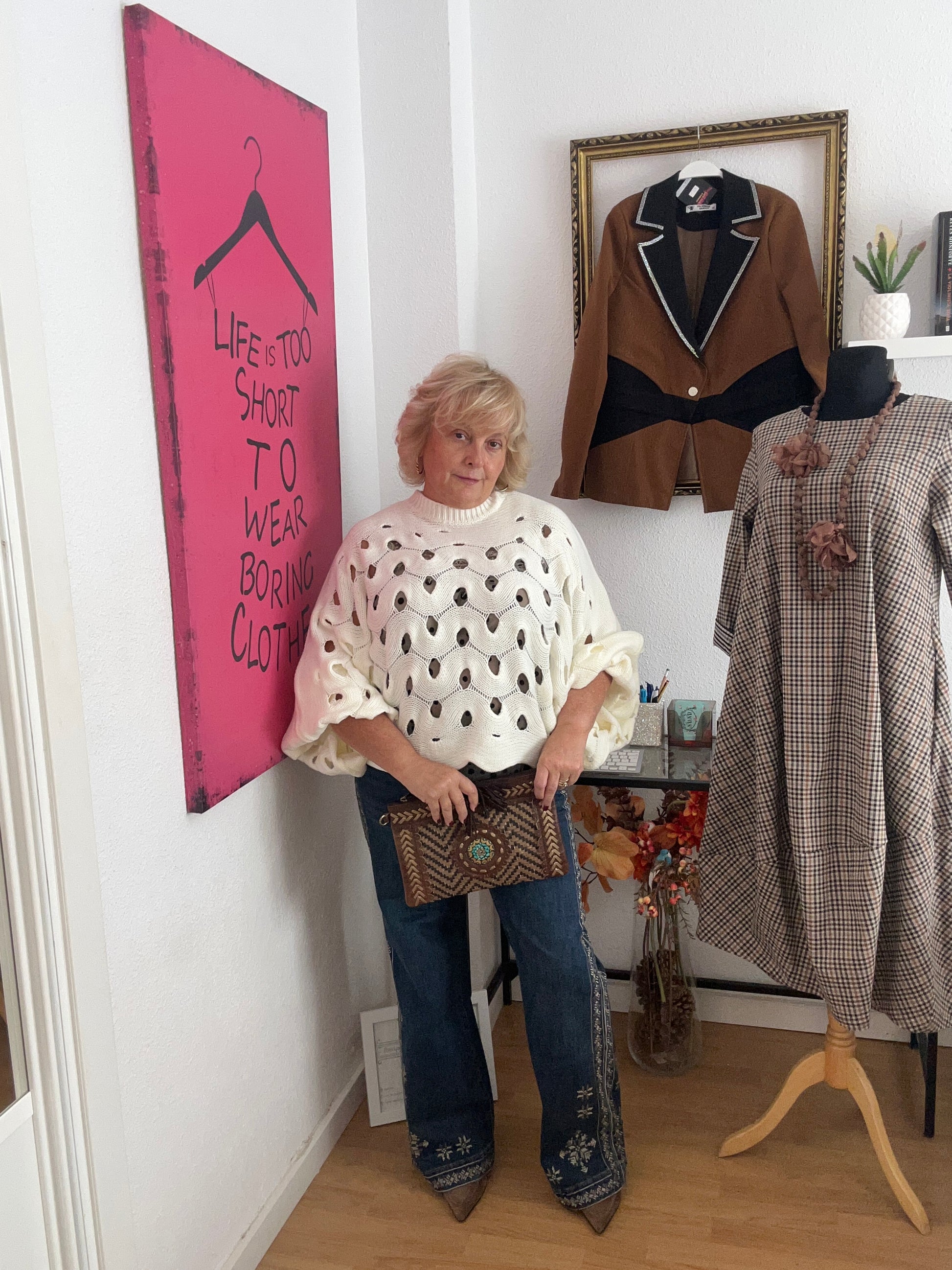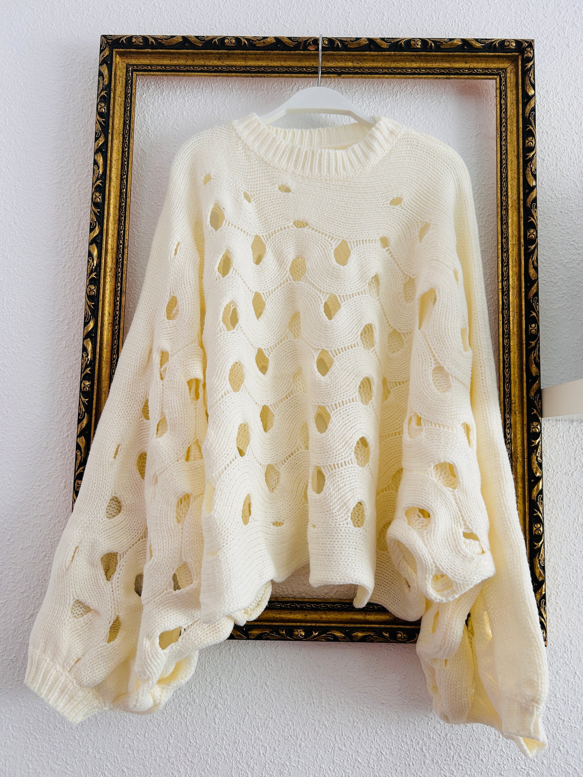 Preciosa y original prenda de punto calado en color nata, 100% poliéster, las mangas son tipo murciélago, ideal para combinar con una lencera o camiseta básica, también con vestido lencero y botas.